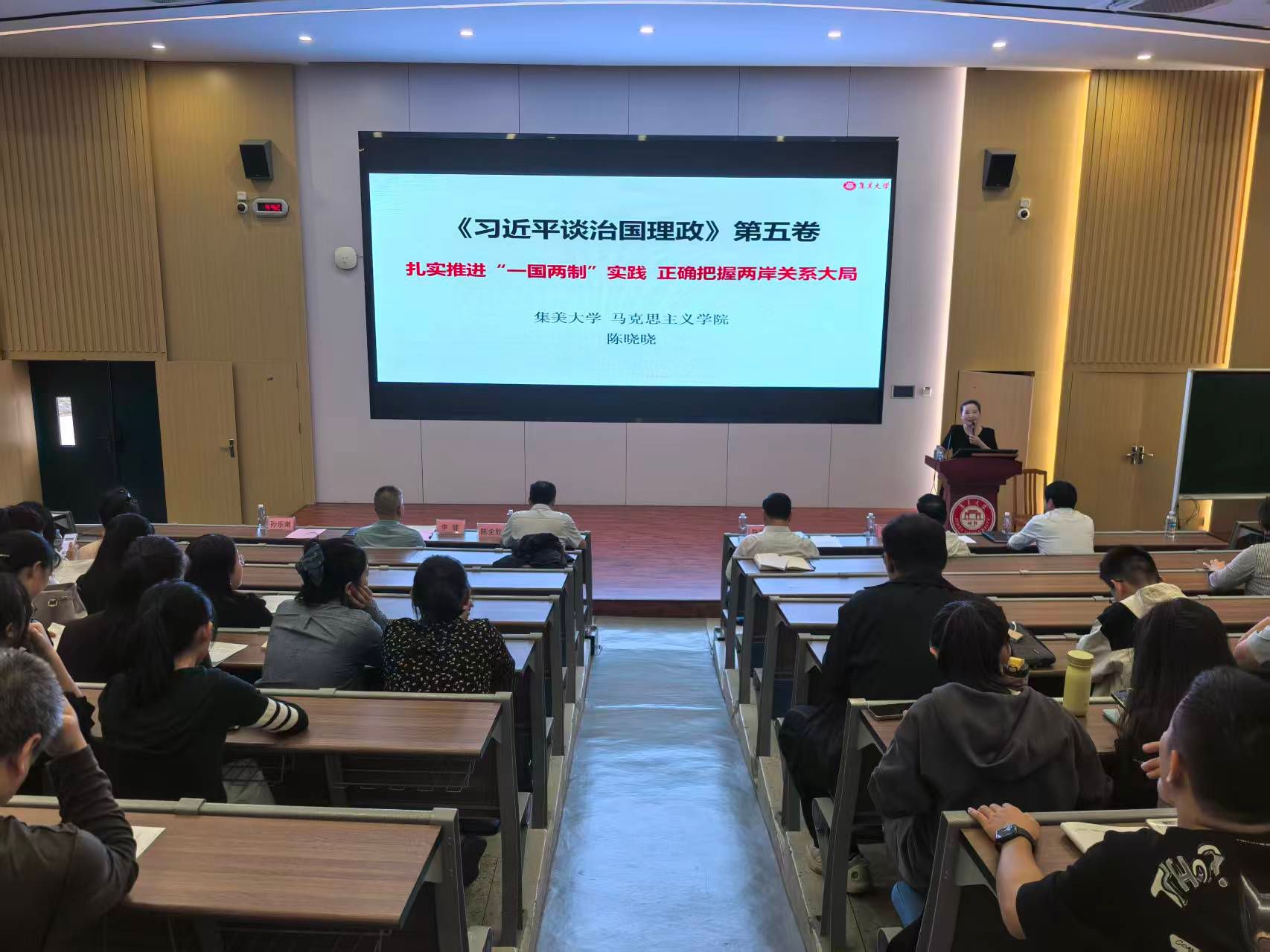 会议邀请马克思主义学院陈晓晓老师作学习《习近平谈治国理政》第五卷专题宣讲报告《扎实推进“一国两制”实践,正确把握两岸关系大局》。陈晓晓重点介绍新时代党解决台湾问题的总体方略,阐述坚持在祖国大陆发展进步基础上解决台湾问题的战略思路,指出实现国家完全统一是中国共产党矢志不渝的历史任务,祖国完全统一一定要实现,也一定能够实现。