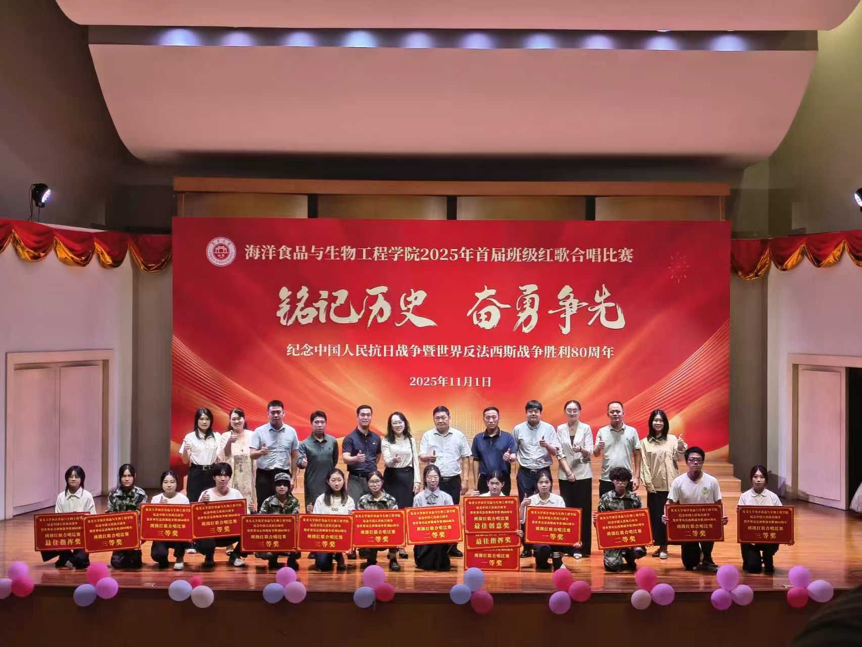 为纪念中国人民抗日战争暨世界反法西斯战争胜利80周年,弘扬爱国主义精神,11月1日晚,海洋食品与生物工程学院举办2025年首届班级红歌合唱比赛决赛。学院党委书记陈福昌、音乐学院院长杨丽霞、校团委副书记李翔、院党委副书记谢杰云、副院长杨燊以及参赛班级班主任和全体辅导员莅临现场,共同见证这场红色视听盛宴。