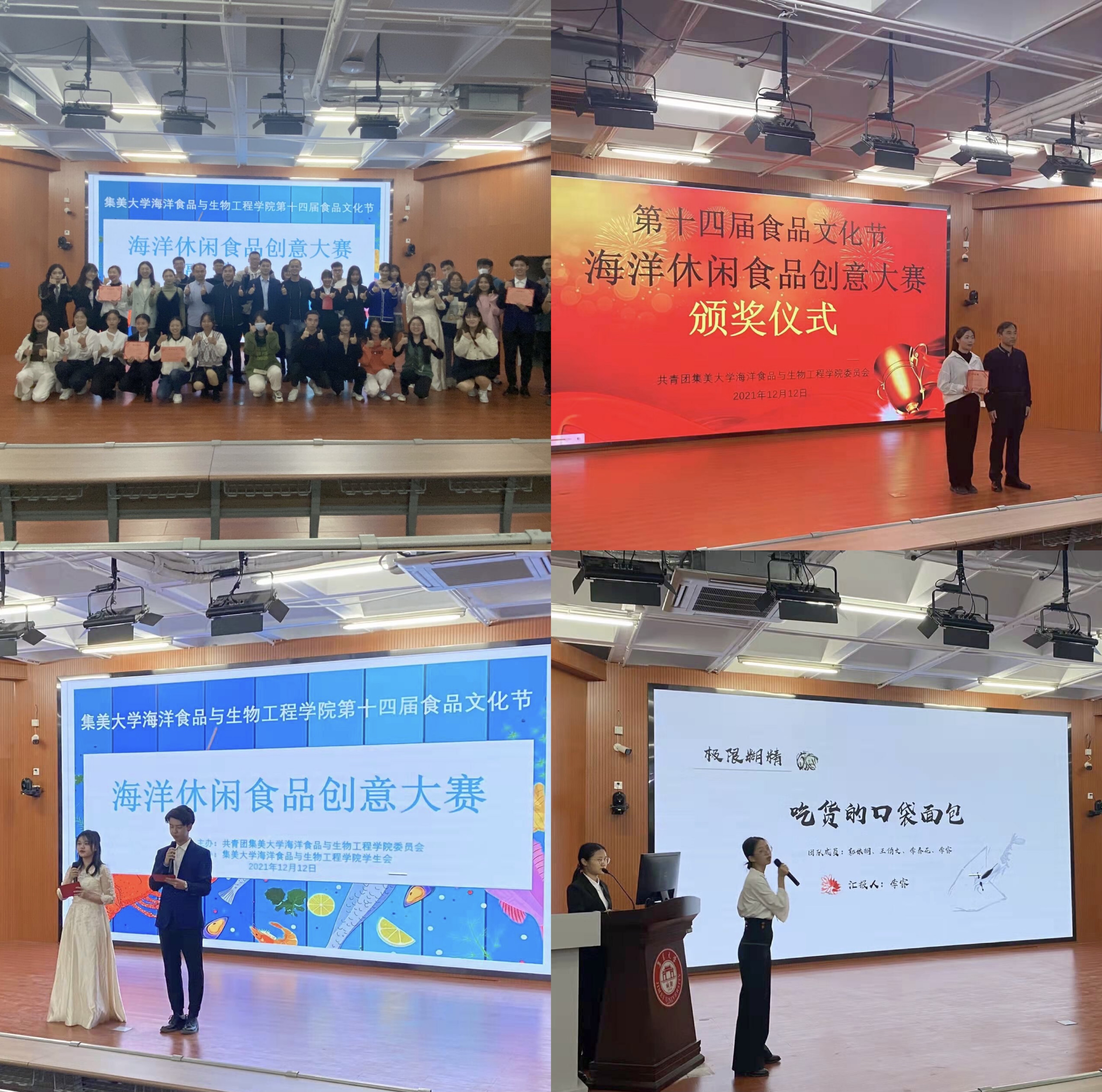 本次大赛的主题是以鱼、虾、贝、海藻等海产品为主要原料进行海洋休闲食品的创意制作,从选材、外观、工艺等方面进行创新。经过初赛的筛选,最终有十支队伍脱颖而出进入决赛。决赛分为演讲和现场答辩两个环节,在决赛中,十支队伍通过ppt演讲的方式形象生动地介绍各自的产品及创意,并向评委老师们展示制作的产品。演讲结束后,评委老师从专业的角度对每组产品进行点评和提问。最终,“织鱼织乐”队过关斩将获得一等奖,“鹑鹑芋动”和“非同寻肠”队获得二等奖,“巷子鱼说”、“吃货的口袋小面包”以及“海洋琥珀”三支队伍获得三等奖,“奶酪鲍鲍”、“虾扯面”、“虾香四溢”和“鱼米之缘”四支队伍获得优秀奖。