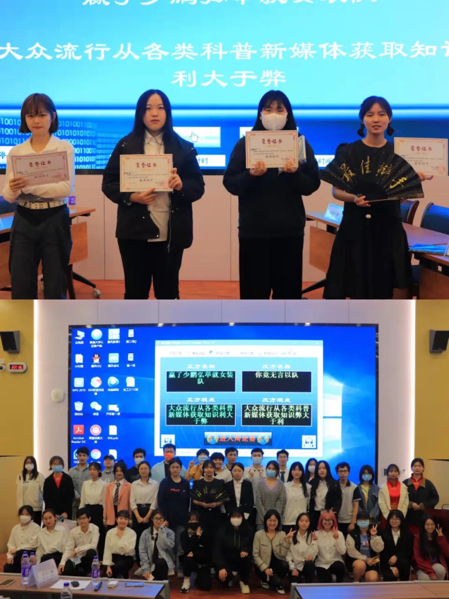 年段八个班级经过激烈角逐,有四个班成功入围决赛。在决赛中,参赛班级分别围绕“当代青年人应该乘风还是破浪”、“从科普新媒体获取知识的利大于弊还是弊大于利 ”两个辩题展开辩论,辩论场面十分火热,辩手们唇枪舌战,充分展现出思辨与语言的魅力。最终,生物2113班获得第一名,刘诗琪同学获最佳辩手。