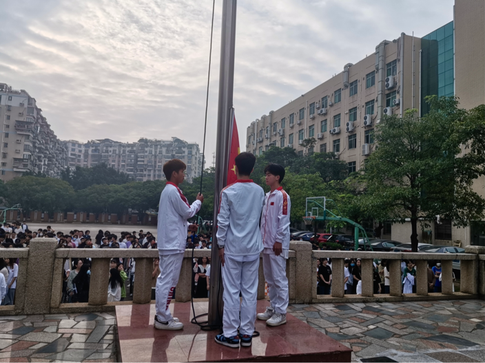 在全体师生的注目下,伴着雄壮激昂的国歌,五星红旗冉冉升起。在场师生庄严肃立,行注目礼,深怀对祖国无限的热爱和崇高的敬意。
