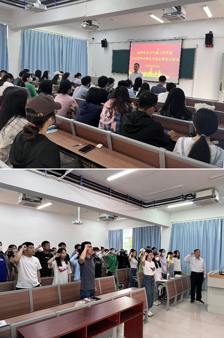 全体毕业生党员面向党旗,高举右手,重温入党誓词。朱坤道为毕业班党员上题为《牢记党员身份,让青春在新征程中绽放绚丽之花》的主题教育专题党课。他充分肯定了毕业生党员在大学期间的优秀表现,并结合毕业生思想教育和管理服务工作,对全体毕业生党员提出希望。