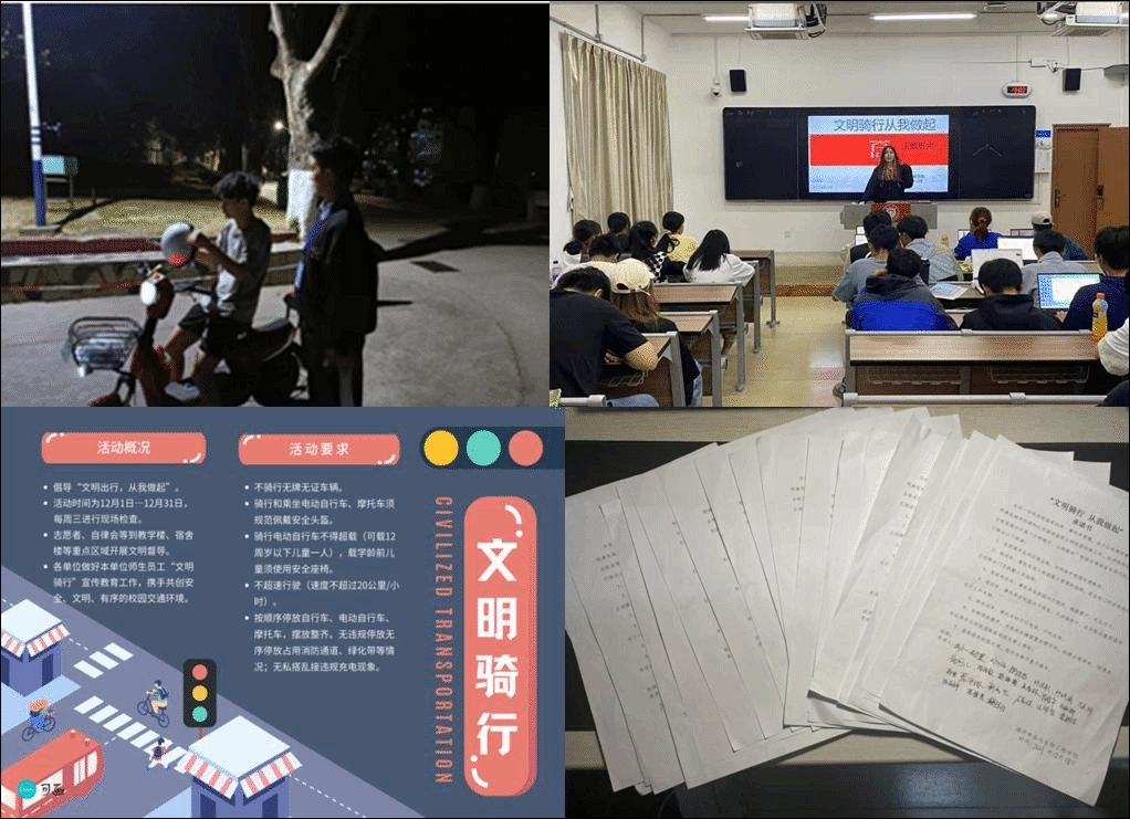 学院组织志愿者力量在上下课、上下班高峰期到责任区重点区域开展常态化交通文明督导工作,包括提醒师生禁止驾驶无牌、超标电动车,出行戴好安全帽,规范有序停车等;各班级通过主题班会,签署“文明骑行”承诺书;通过全院教职工大会、升旗仪式讲话、微信公众号推文、海报等方式向师生普及交通安全知识。