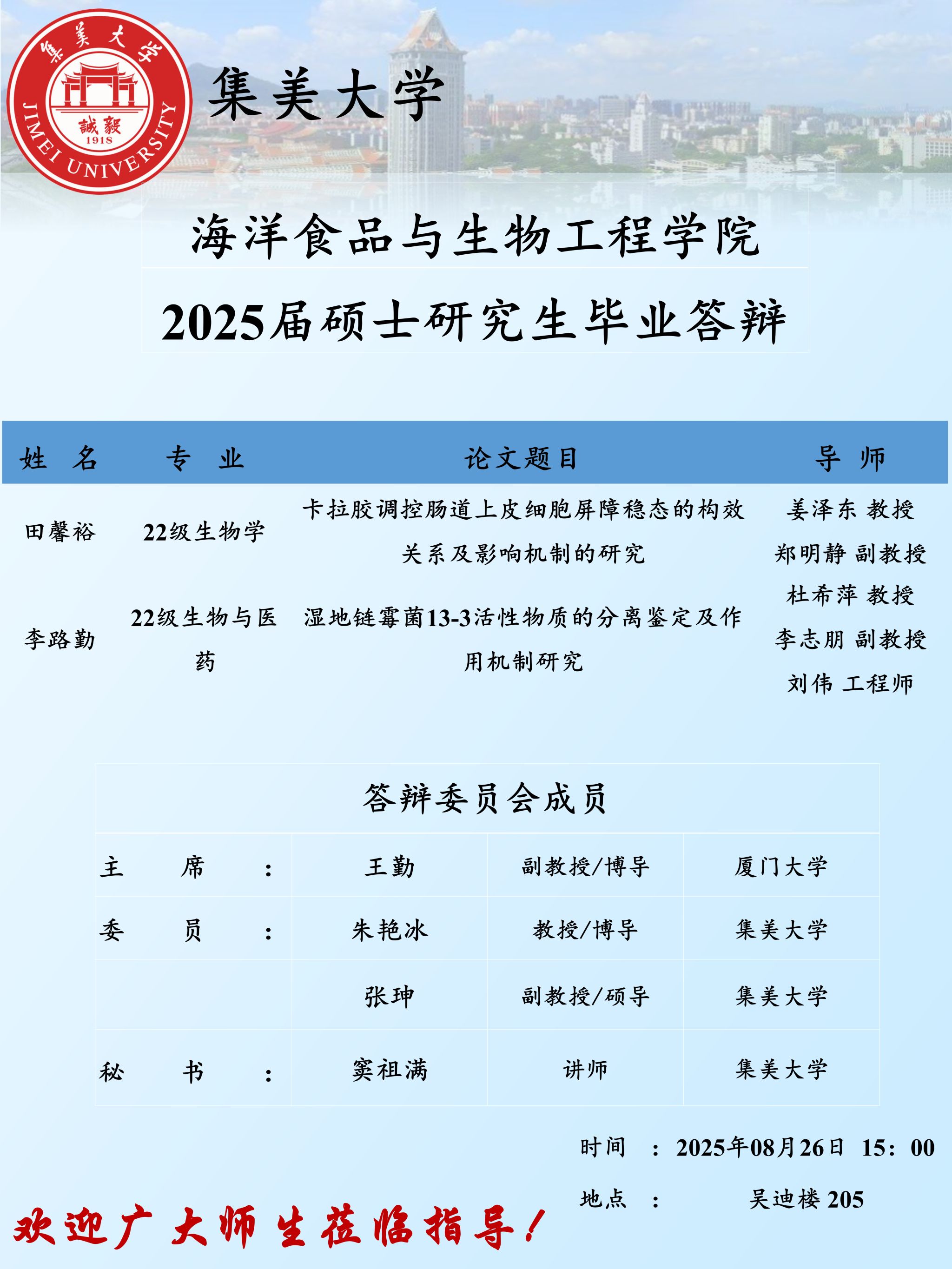 2025届硕士研究生毕业答辩公告(2025.08.26)