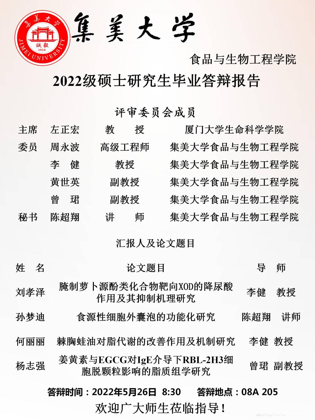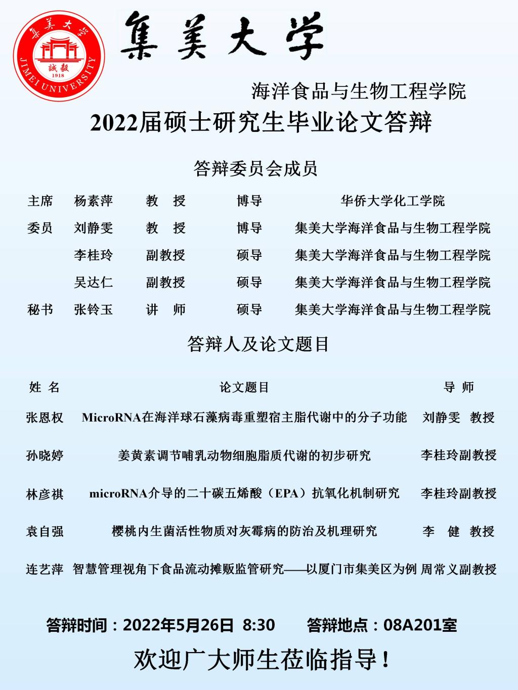 2022届硕士研究生毕业论文答辩公告(2022.05.26)