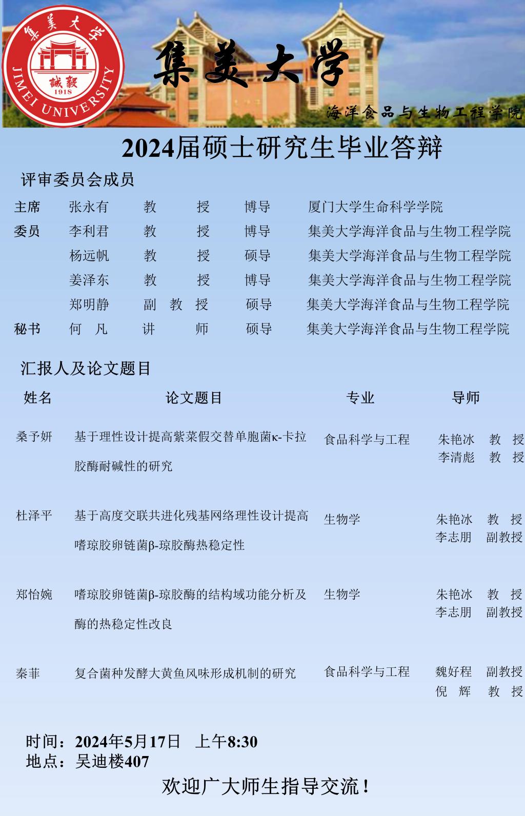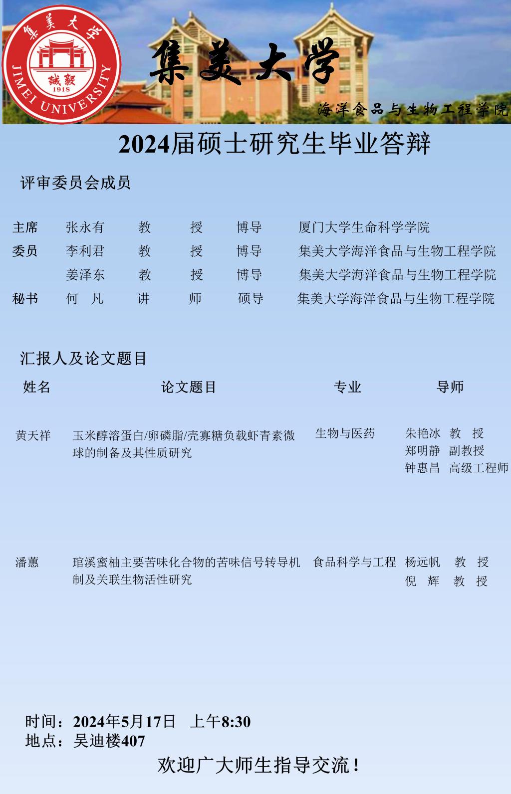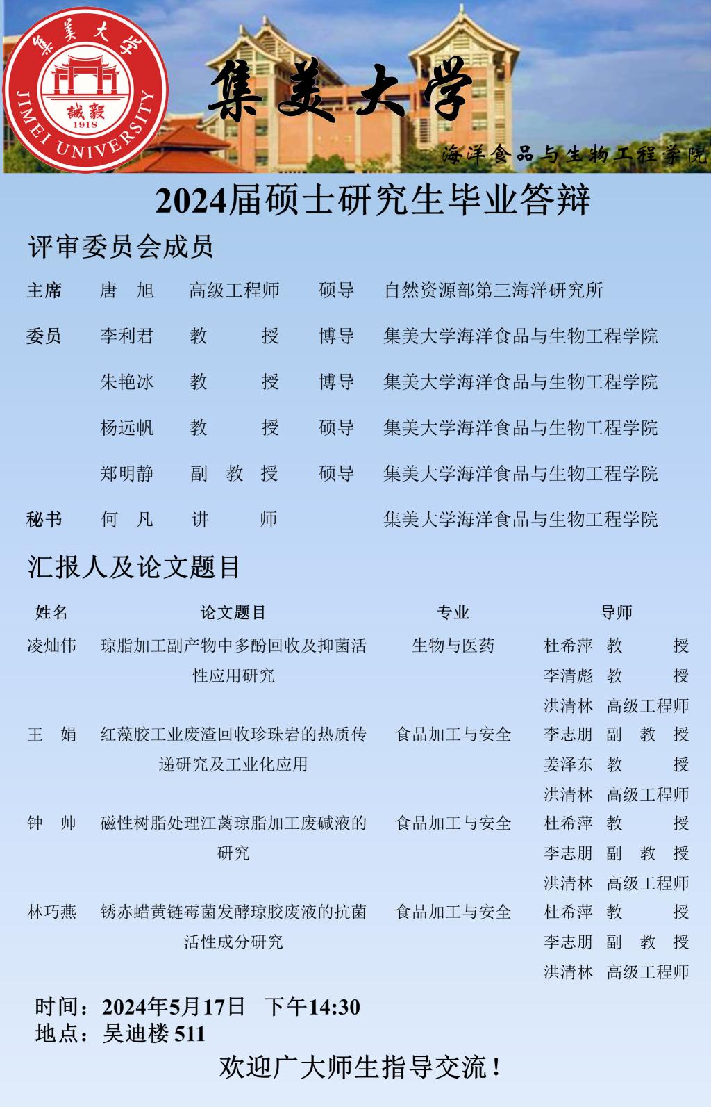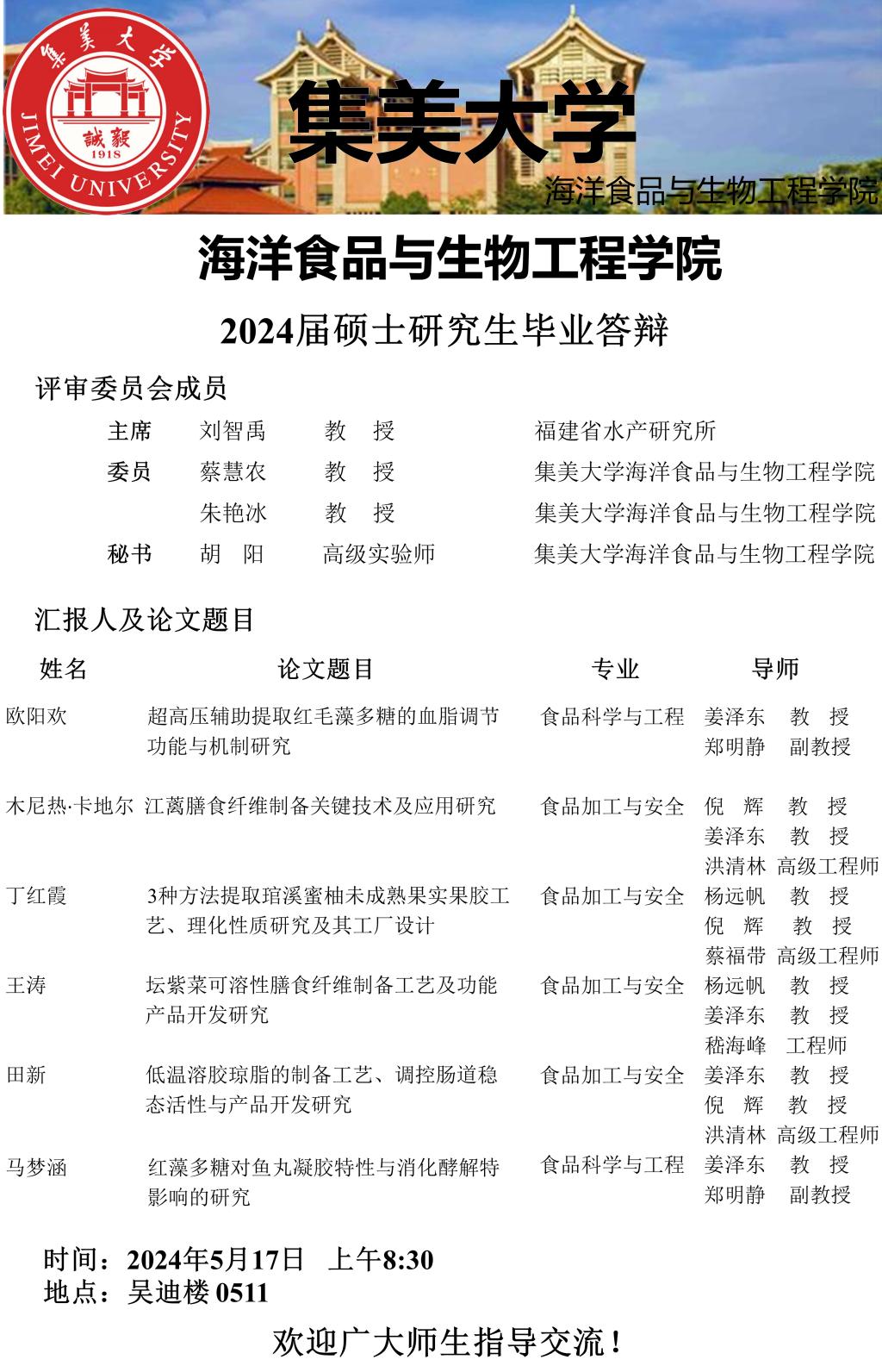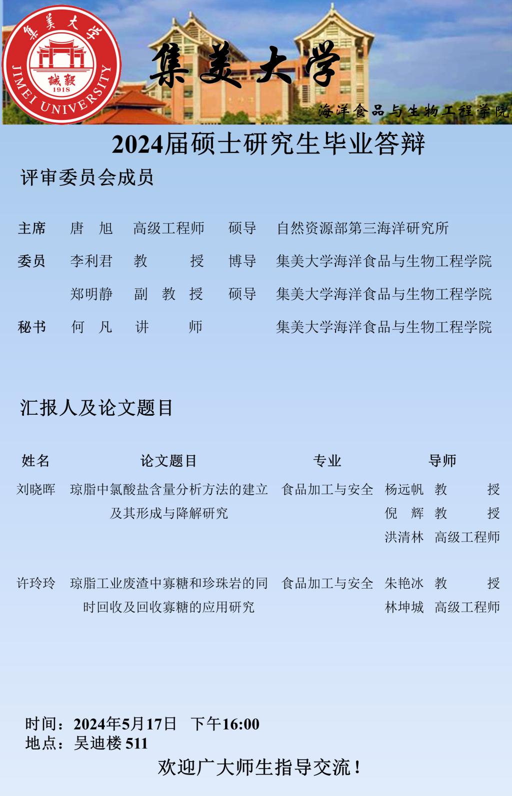 2024届硕士研究生毕业答辩公告(2024.05.17)