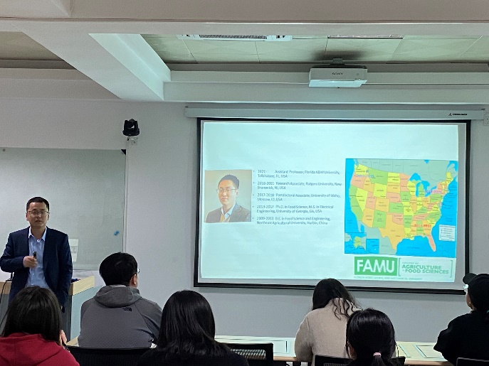谭居中博士研究对象主要为美国汉麻、厚皮葡萄和可可粉等,涉及领域包括汉麻和厚皮葡萄的加工及加工副产物的高值利用,厚皮葡萄生长过程的种植管理和监控。谭居中博士还介绍了他今年发表的关于等离子技术在食品除菌方面的四项研究成果和利用数字模拟监控可可豆发酵的研究。谭居中博士的报告生动有趣,开阔了师生们的学术视野,进一步激发了同学们对科研的兴趣。(文/图:刘夏磊)