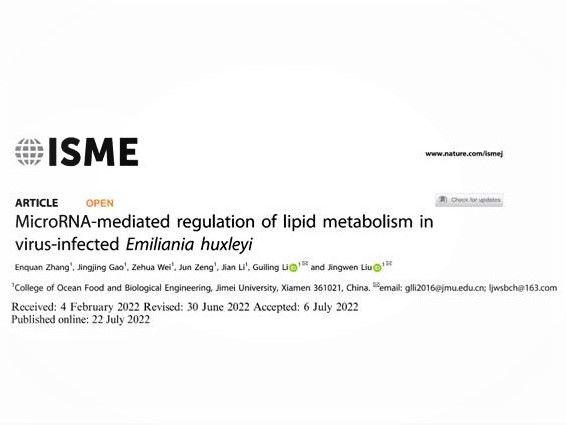 近日,我院刘静雯教授课题组在Nature旗下的国际微生物学顶级期刊《The ISME Journal》(IF: 11.217)在线发表了题为 “MicroRNA-mediated regulation of lipid metabolism in virus-infectedEmiliania huxleyi”(MicroRNA在病毒重塑海洋球石藻脂代谢中的调控机制)的研究论文。集美大学为唯一完成单位,文章前三作者分别为我院2019级、2018级生物学硕士研究生张恩权、高菁菁和2020级生物工程专业本科生魏泽华同学;李桂玲教授和刘静雯教授为共同通讯作者。